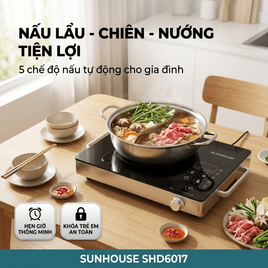 Với thiết kế gọn, công suất lớn, tính năng đa dụng và độ an toàn cao, SUNHOUSE SHD6017 là lựa chọn phù hợp cho gia đình, căn hộ nhỏ, phòng trọ hoặc các bữa ăn quây quần tại nhà.