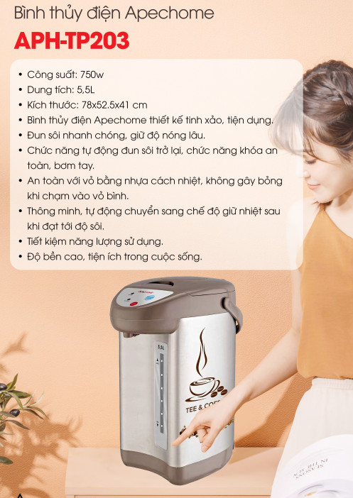 Bình thủy điện Apechome thiết kế tinh xảo, tiện dụng.