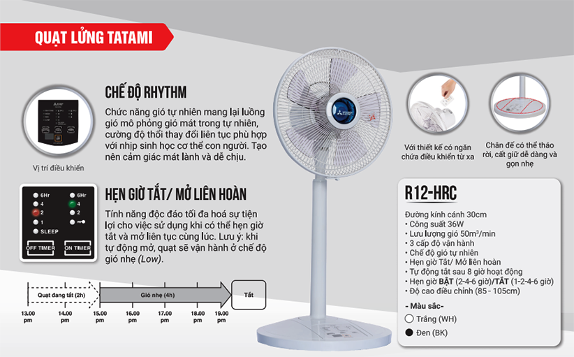Nếu bạn ưu tiên một chiếc quạt gọn đẹp, gió tự nhiên Rhythm, nhiều tùy chọn hẹn giờ tiện nghi cho giấc ngủ, Mitsubishi R12-HRC là lựa chọn tinh tế cho không gian hiện đại. Liên hệ Tuvina để được tư vấn màu Trắng/Đen phù hợp nội thất.